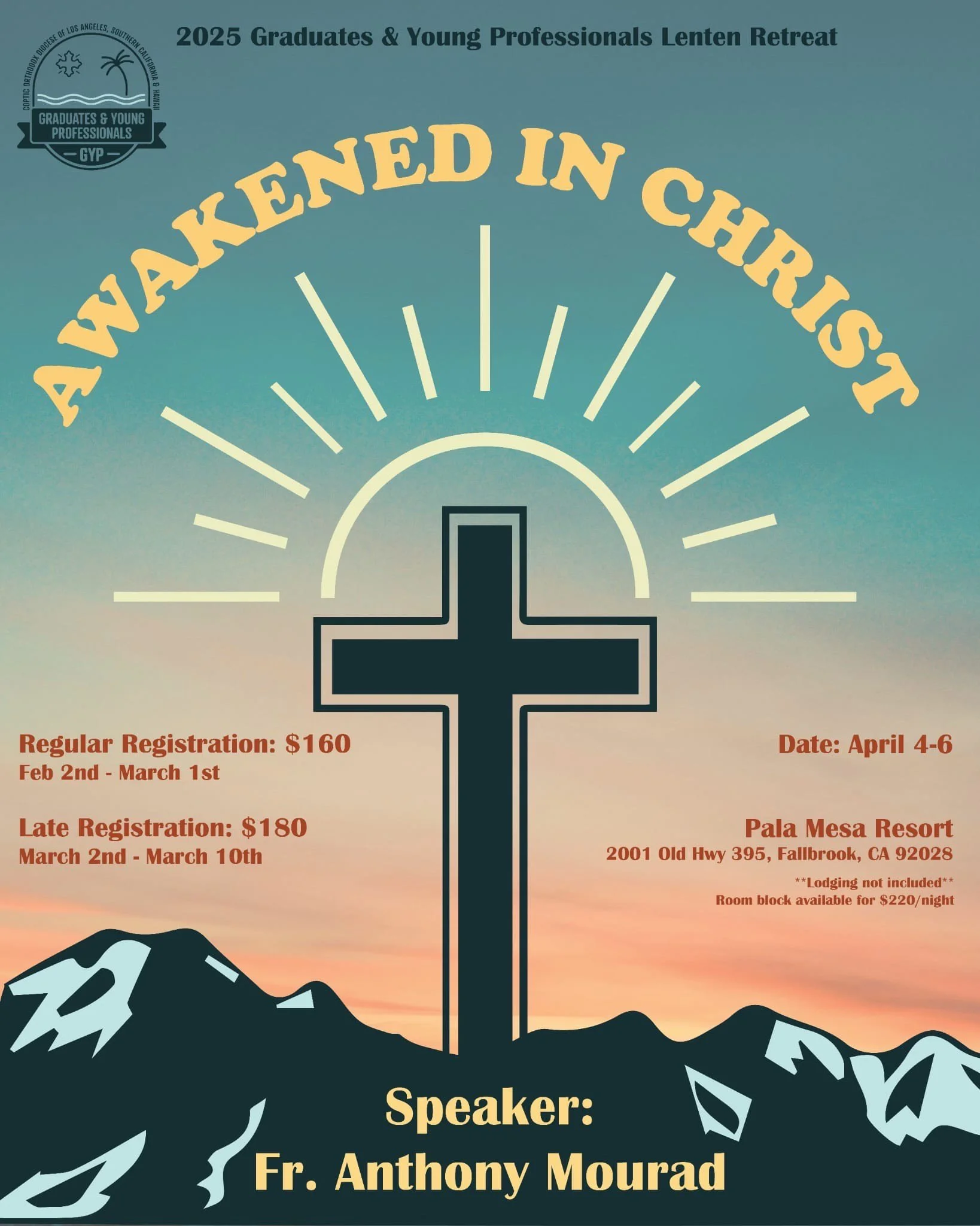 Under the auspices of His Eminence Metropolitan Serapion, the Graduates and Young Professionals (GYP) committee invites you to our Annual GYP Lenten Retreat on April 4-6, 2025! This year we are blessed to have Fr. Anthony Mourad, lead us in a spiritual and introspection discussion as our speaker. We are looking forward to benefiting spiritually together and enjoying Christ in fellowship with one another.