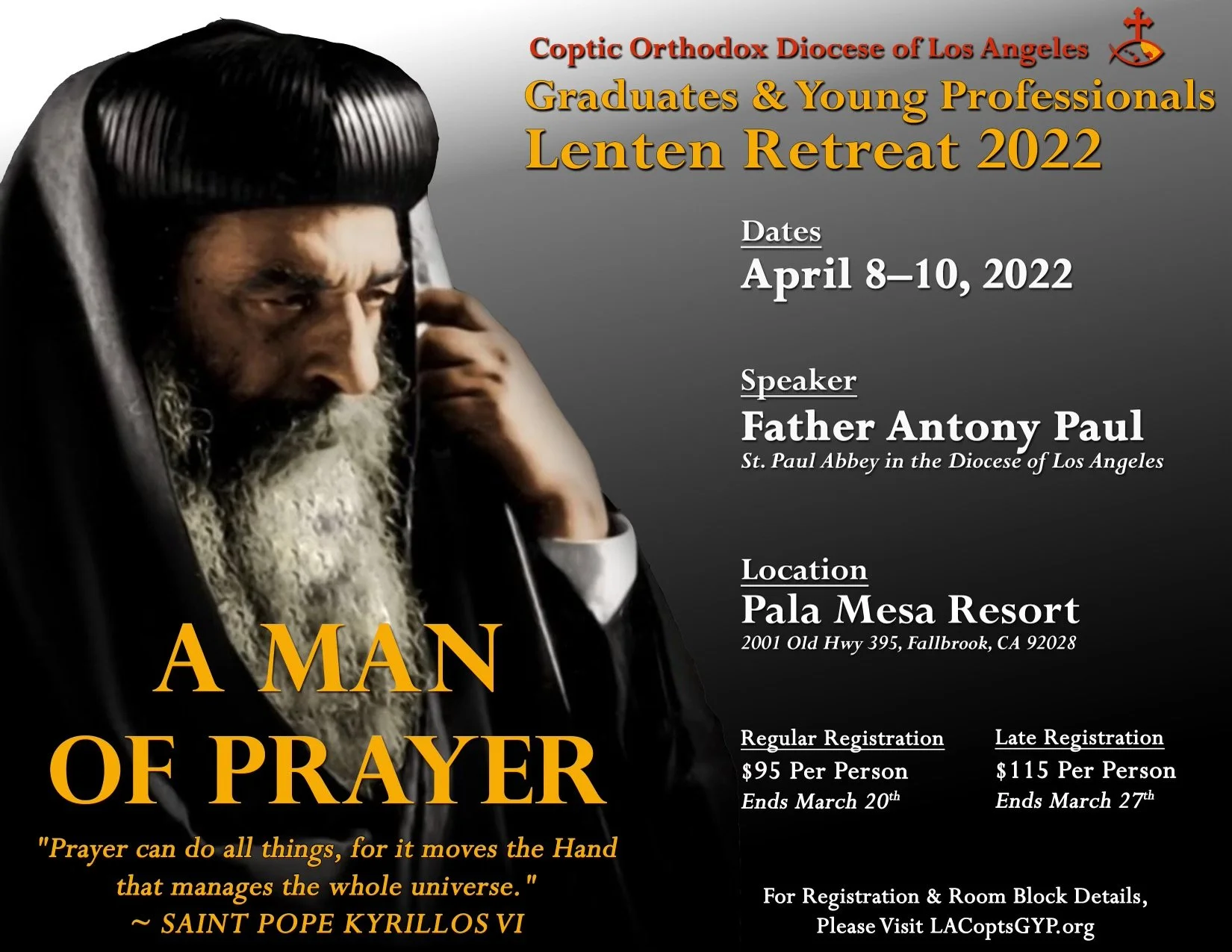 Under the auspices of His Eminence Metropolitan Serapion, the Graduates and Young Professionals (GYP) committee cordially invites you to the 11th Annual Lenten Retreat on April 8-10, 2022. This year we are blessed to have Fr. Antony Paul, of the Saint Paul Brotherhood to lead us in a spiritual discussion on “Saint Pope Kyrillos the 6th: A Man of Prayer”.Don’t miss out on the opportunity for spiritual contemplation, growth, and fellowship